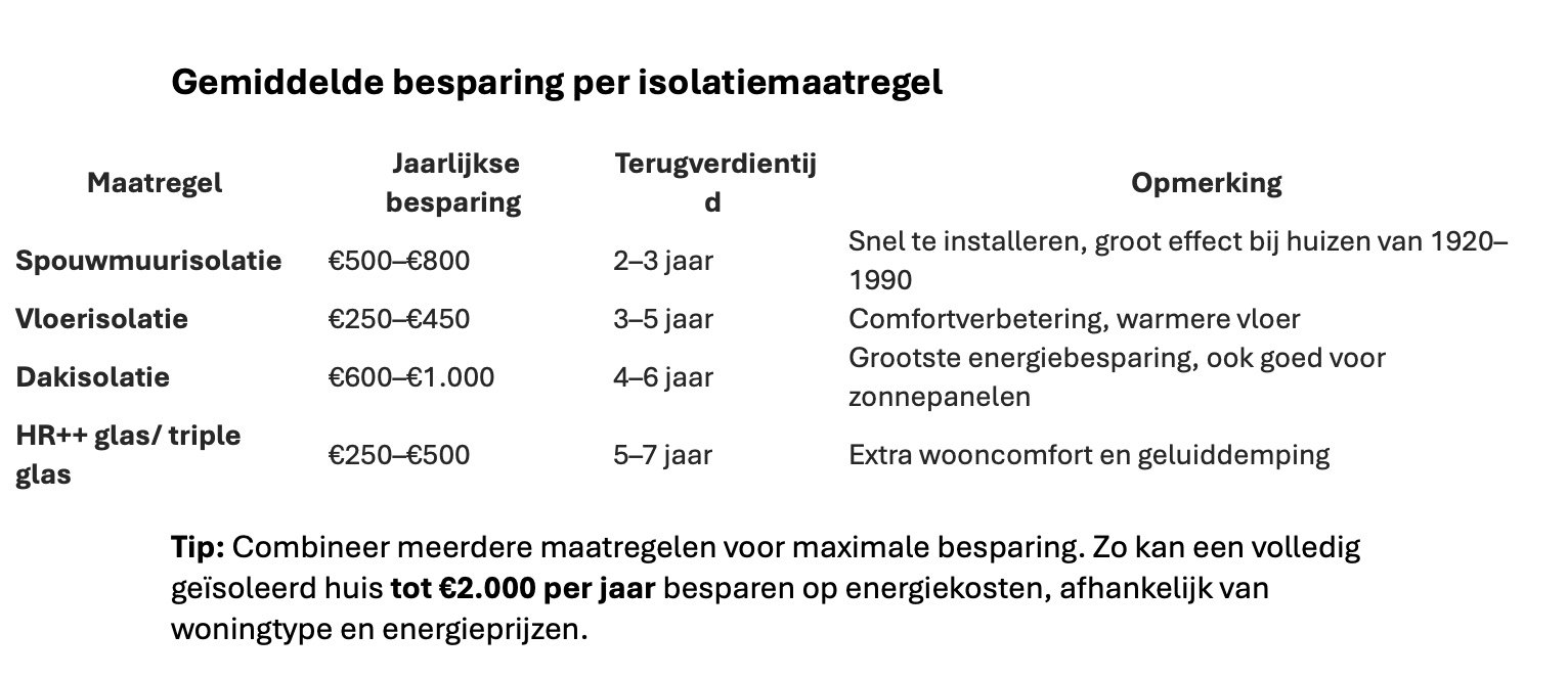 Afhankelijk van de maatregelen bespaar je gemiddeld €250–€1.000 per jaar per maatregel, en volledig geïsoleerde woningen kunnen tot €2.000 per jaar besparen.