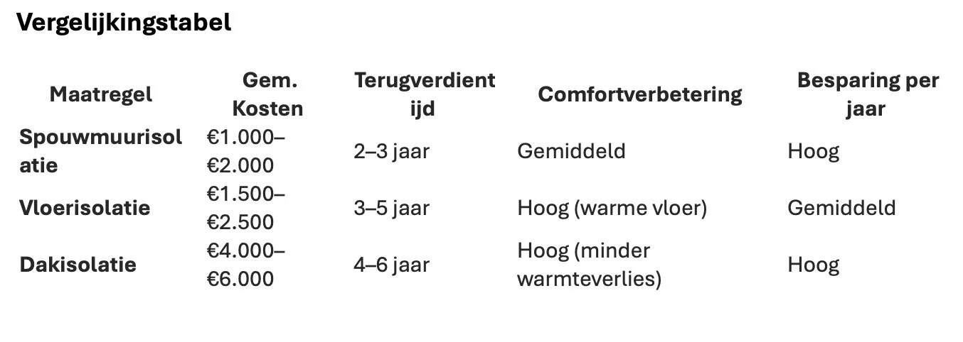 Spouwmuurisolatie is vaak de snelste en goedkoopste maatregel, vloerisolatie levert veel comfort op en dakisolatie bespaart het meeste op de lange termijn.